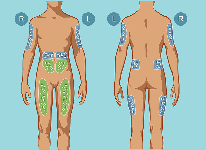 Usually, SCIg is administered under the skin on the belly, inner thighs, or outer buttocks.8 Sometimes, the upper arm areas can be used as well.7 (See Figure 15.) Where to stick the needle (called the site) and how many sites will be needed depend on how much SCIg (called the volume) is going to be infused that day. Infusion sites are also dependent on the patient, who may choose where it is most comfortable to place a needle during an infusion. Sometimes, only one site is required; other times, many sites are needed to complete an infusion. Depending on the product and dosage, the prescriber will calculate the volume and how often to infuse the SCIg (called intervals). Larger intervals between infusions require larger amounts of product to achieve the required total SCIg dose to help the patient fight off infections (called a clinical response). It is important to remember that, just as every patient is unique, so every brand of SCIg is unique. Depending on which brand of SCIg is being used, the intervals and volume can be tailored to the unique medical needs and lifestyle of a particular patient. As long as the product’s total recommended dose is delivered every month, a patient can receive their brand-specific infusion as often as daily or, weekly, or biweekly.4,7