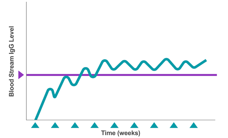 IVIg is considered safe, which is why it is indicated for several medical conditions requiring Ig therapy.5 Every 3 or 4 weeks, a nurse administers the full dose of IVIg directly into the patient’s bloodstream (or circulatory system), using an IV catheter.5,11 Thus, a large amount of antibodies enters the circulation in a short time and is used up (or metabolized) over the next few weeks.11 This causes the IgG levels to be at their highest (called a peak) right after an infusion and at their lowest (a trough) just before the next dose is due.3 The trough period is often referred to as “washout”. Fluctuations in IgG levels (peaks and troughs) can put IVIg patients at risk of infection as they approach their trough serum levels. These fluctuations can also cause some adverse events when the patient reaches their trough levels.5