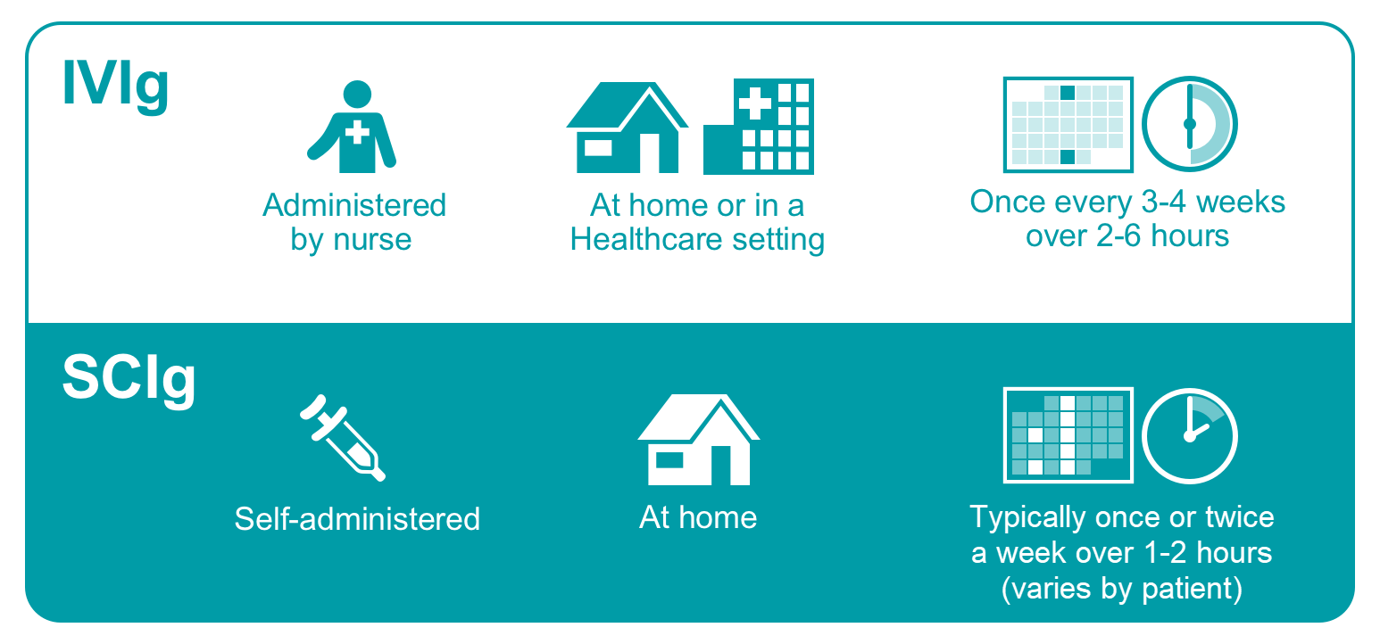 IgRT is often the therapy of choice for most PI-affected patients and has been found to have a positive effect on their health-related QoL, including less fear of future infections.8,9 However, these treatments do require significant lifestyle adjustments—and are usually required for life.6,8 For example, IVIg is typically administered by a nurse, either at home or in a healthcare setting, once every 3 to 4 weeks over 2 to 6 hours.9,10 SCIg is usually self-administered at home once or twice a week over 1 to 2 hours.9,10